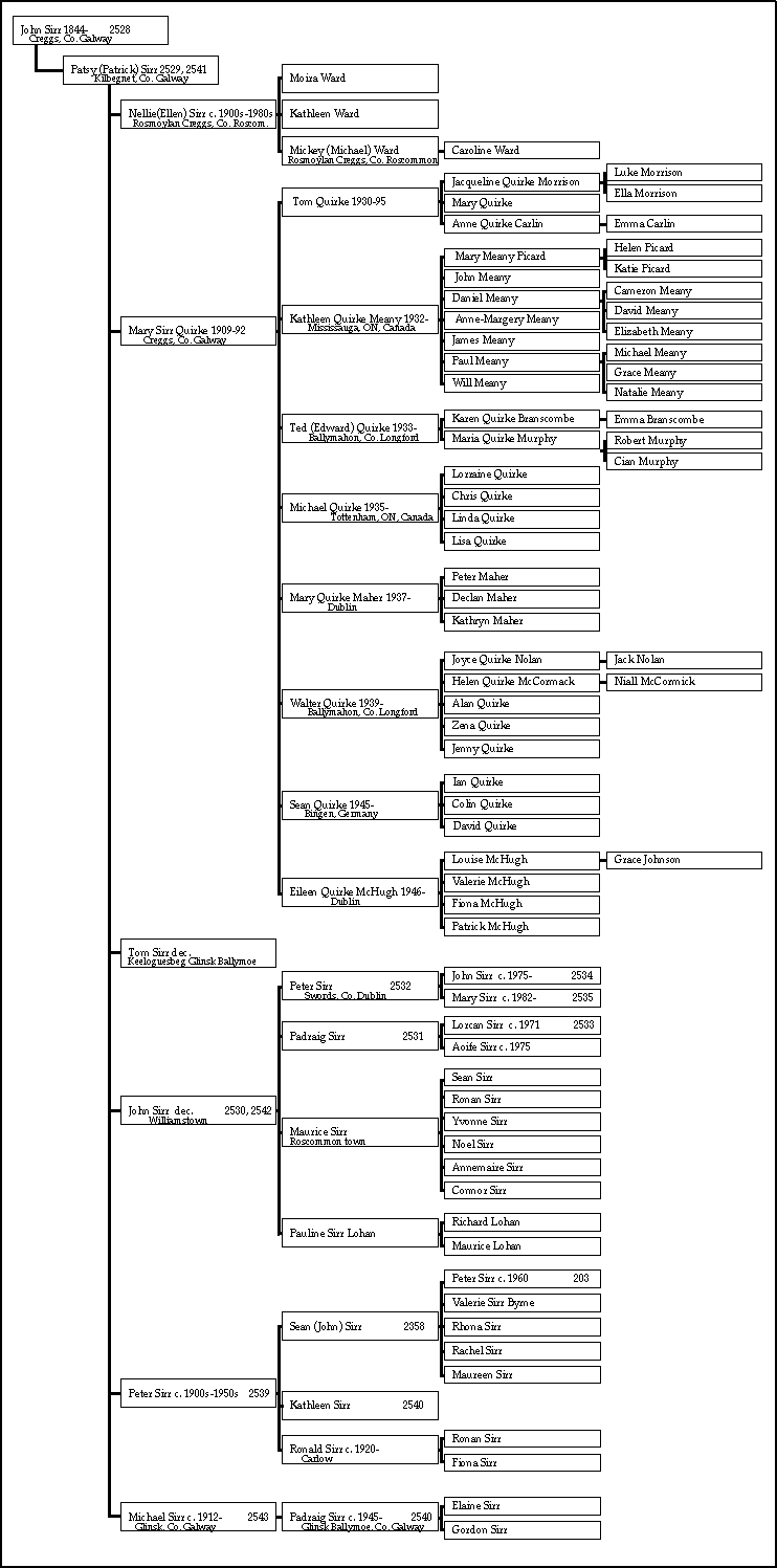 The names in red indicate the people I am directly descended from. These Sirrs are from Keeloguesbeg, Glinsk, Ballymoe in Co. Galway. My grandparents lived in Moneen Creggs, in Kilbegnet Parish.